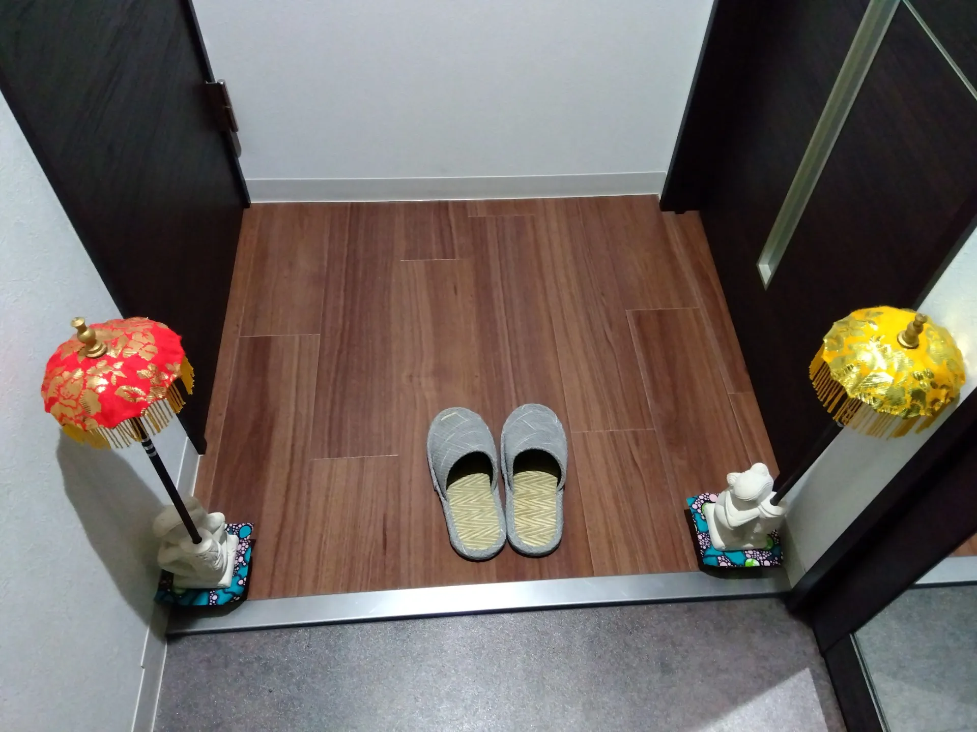カエルとセットの置物なので横に並べようかとも思いましたが、あの2人は玄関でお客様をお迎えしたいようなのでこのままで…