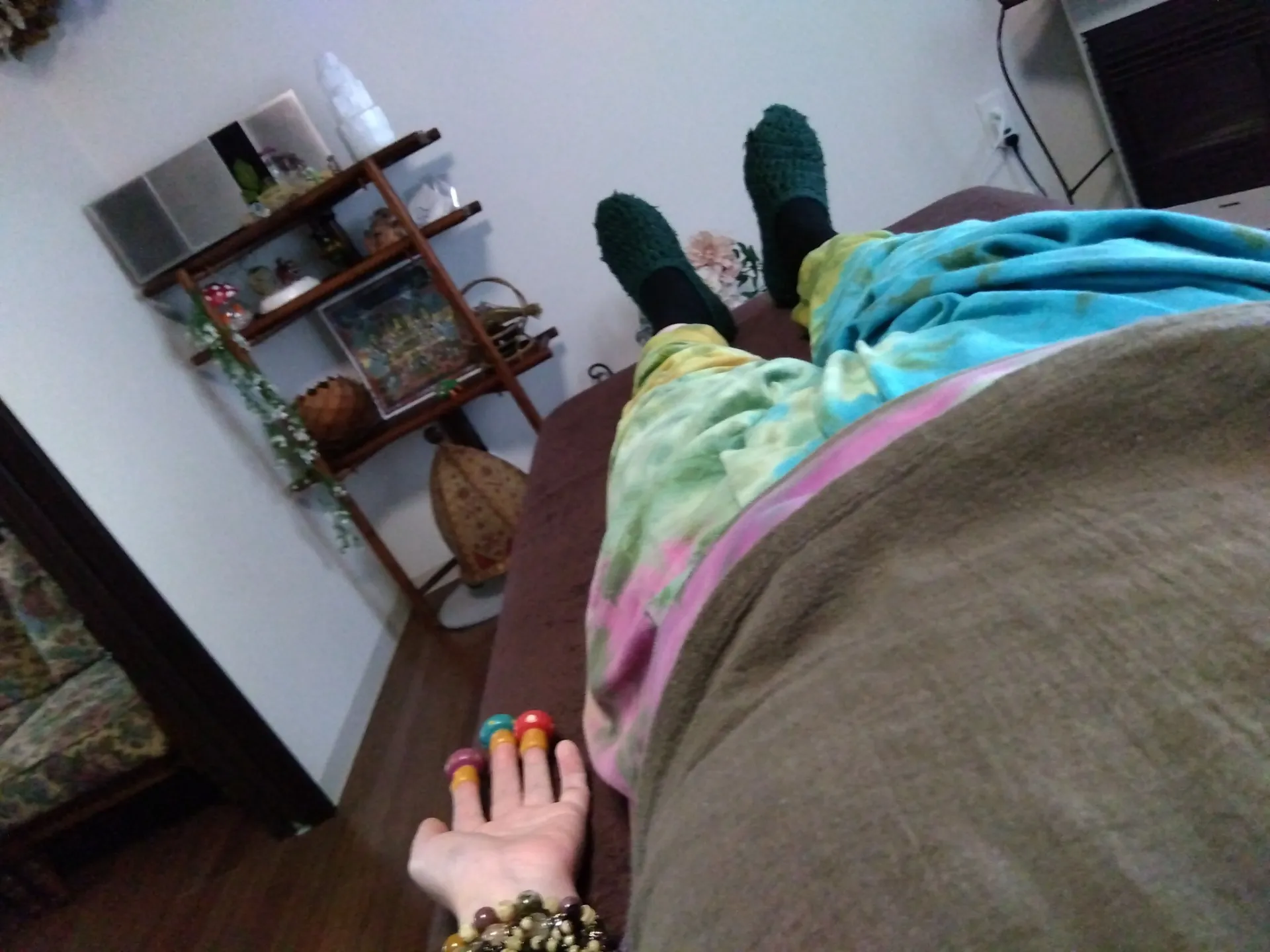 赤、青、オレンジ、紫、を指にはめ、身体の痛かったところを触ると痛みが無くなった!!